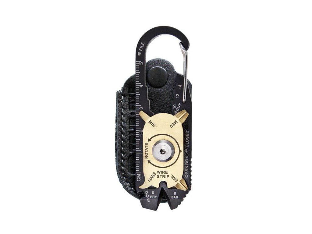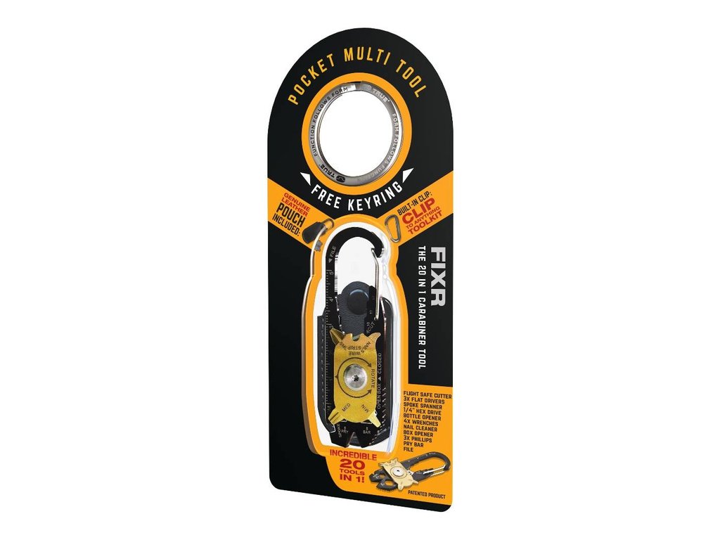 Multifunkční nářadí The Fixr od britské firmy True Utility lze díky jeho kompaktním rozměrům mít neustále při sobě. Potřebujete otevřít lahev, utáhnout šroubek u skříňky nebo u hodinek? Na to všechno vám vystačí toto univerzální nářadí! The Fixr je vyroben z kvalitní nerezové oceli, potažené vrstvou černého titanu. Má zabudovanou karabinu pro rychlé a jednoduché upínání ke kroužku na klíče nebo přímo k opasku. Můžete si ho s sebou vzít bezpečně i do letadla.