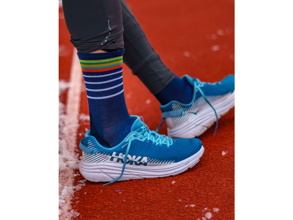 Ultralehké kotníkové ponožky z jemného materiálu s vyšším podílem merina. Perfektně přiléhají k noze, nárt je žebrovaný a obzvlášťě prodyšný, spodek ponožky zase obsahuje podporu klenby, která pomáhá tlumit únavu a otřesy. Pevný horní lem zabráňuje kamínkům a dalším nečistotám, aby se dostaly dovnitř. Ponožky v botě nekloužou, neshrnují se a díky merinu nezapáchají ani po vysoce intenzivní aktivitě. Díky těmto vlastnostem můžete zapomenout na puchýře i otlaky a bezstarostně si užívat běhu.